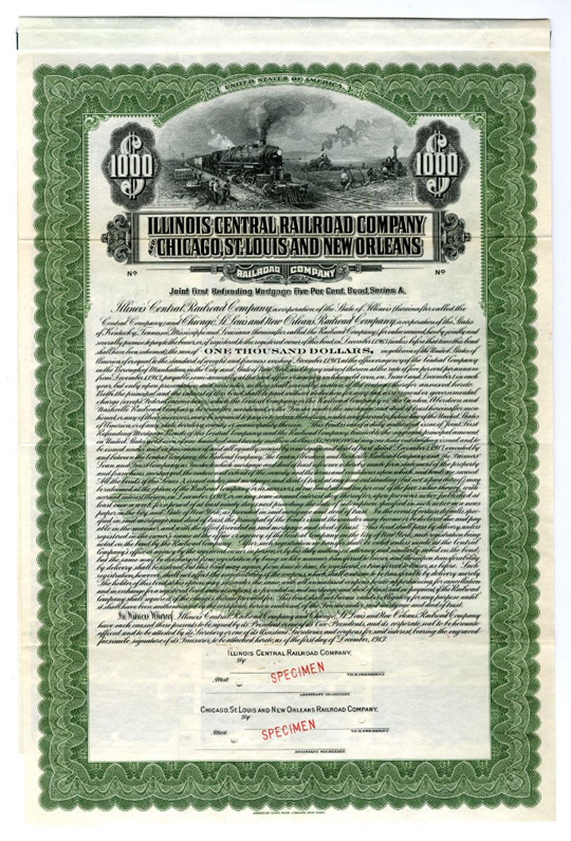 Louisiana. Illinois, 1913. $1000 Specimen 5% Joint First Refunding Mortgage Series A Coupon Bond, Black with green border and underprint, Locomotive passing farmers working fields at top center, Specimen overprints and POCs, AU to UNC condition, ABNC.