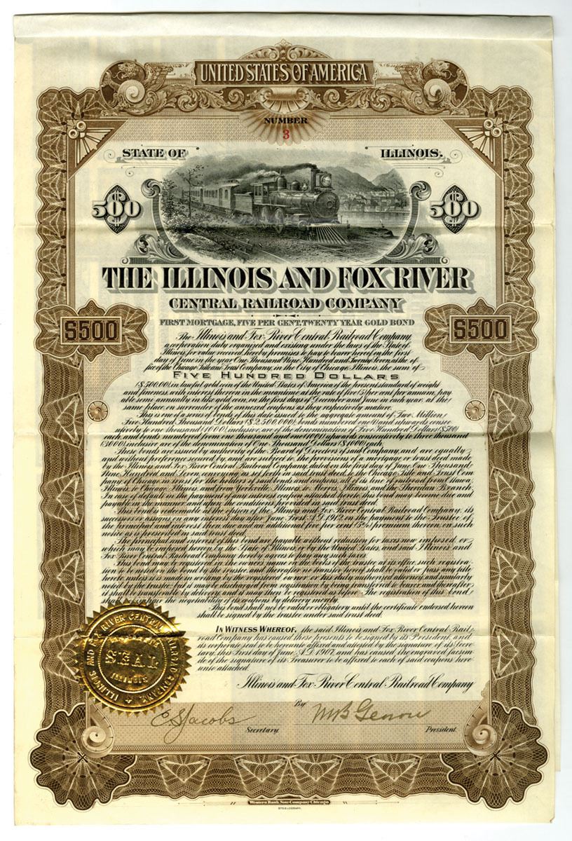 Illinois...., 1907. $500 I/U 5% First Mortgage Twenty Year Gold Coupon Bond, Black print with brown border and underprint, Vignette of locomotive at top center with gold embossed seal at bottom left, S/N 3, XF to AU condition. WBNC. Listed railroad in Cox, no examples have been seen or photographed