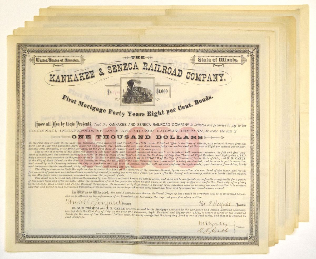 Illinois, 1881. $1000 I/U Lot of 7 First Mortgage Forty-Year 8% Bonds, Black print with black border and red underprint on large format certificates, Condition ranges from VF to XF overall, with folds, light toning, and typical handling wear. (7). Sold “AS IS” no returns accepted.