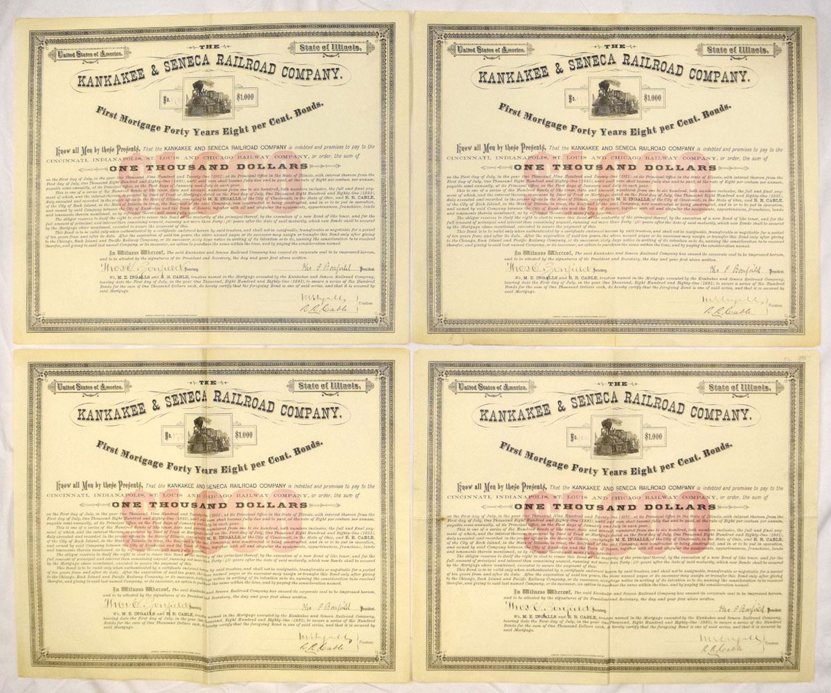 Illinois, 1881. $1000 I/U Lot of 7 First Mortgage Forty-Year 8% Bonds, Black print with black border and red underprint on large format certificates, Condition ranges from VF to XF overall, with folds, light toning, and typical handling wear. (7). Sold “AS IS” no returns accepted.