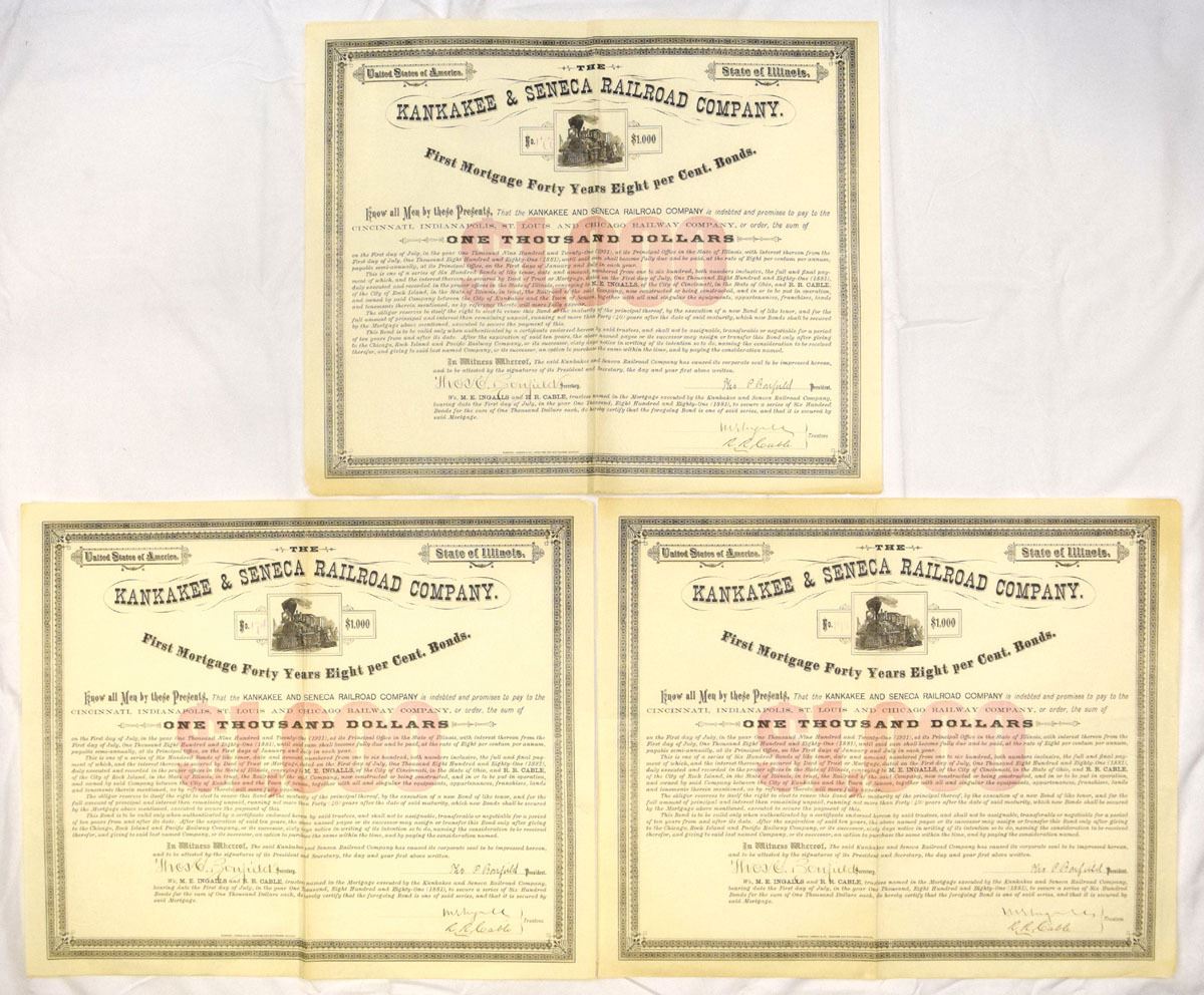 Illinois, 1881. $1000 I/U Lot of 7 First Mortgage Forty-Year 8% Bonds, Black print with black border and red underprint on large format certificates, Condition ranges from VF to XF overall, with folds, light toning, and typical handling wear. (7). Sold “AS IS” no returns accepted.