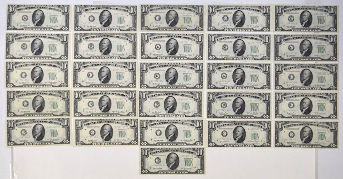 Illinois & New York…..., 1950. Lot of 26 Issued Banknotes, Includes: $10, Series 1950, Fr.# 2010B; $10, Series 1950, Fr.# 2010G (10); $10, Series 1950A, Fr.# 2011G (15). Notes range from AU to UNC condition. (26). Sold "AS IS" no returns accepted.