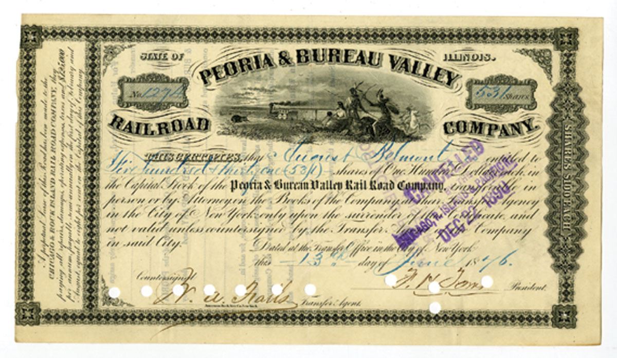 Illinois, 1876. 531 Shares I/C Capital Stock Certificate, Black print with black border, Native family watching train go past while hunting buffalo at top center, Issued to August Belmont but not signed by him, August Belmont (1813–1890) was a German-born American banker, diplomat, and Democratic Party leader, who represented the Rothschilds in the U.S., served as Minister to the Netherlands, and later lent his name to the Belmont Stakes horse race. S/N 1274, POCs and stamp cancelled at bottom, VF to XF condition, ABNC.