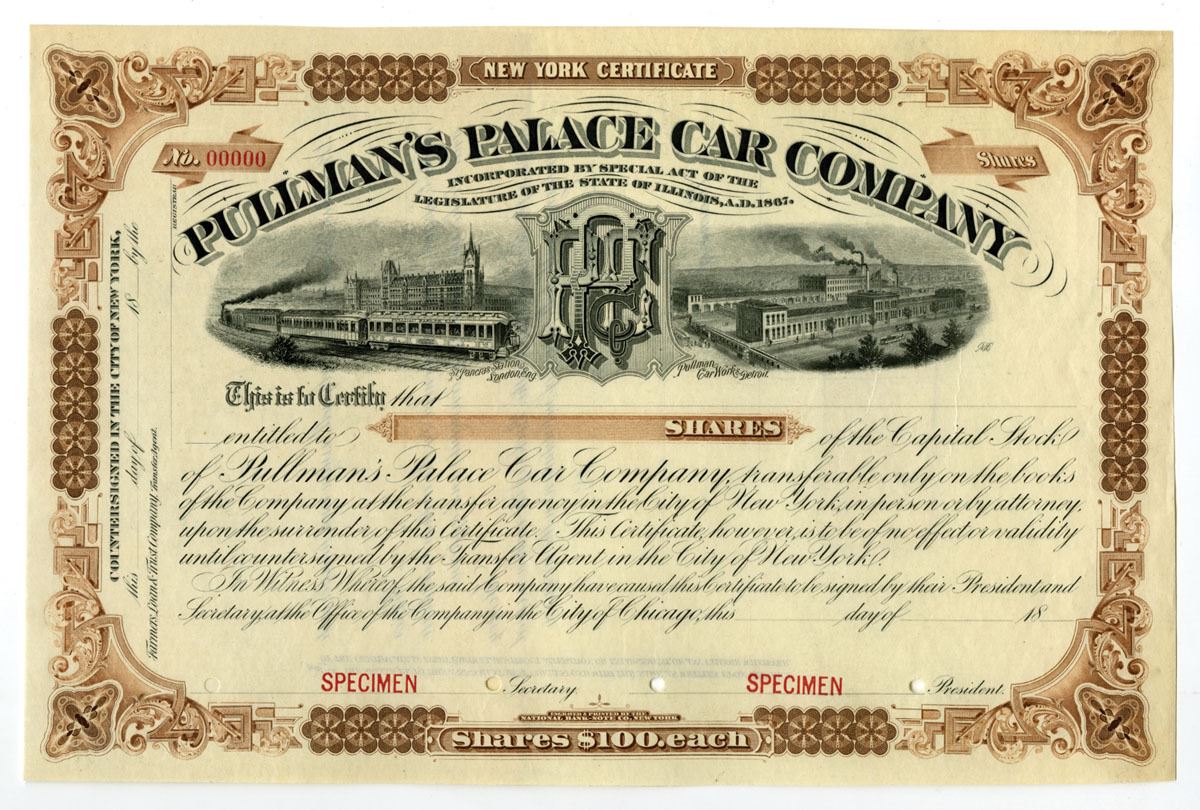 Illinois, ND (1880s). Odd shares Capital Stock Specimen Certificate, Black with brown border, Pullman factory at top center, Specimen overprints and POCs, VF to XF condition. NBNC.