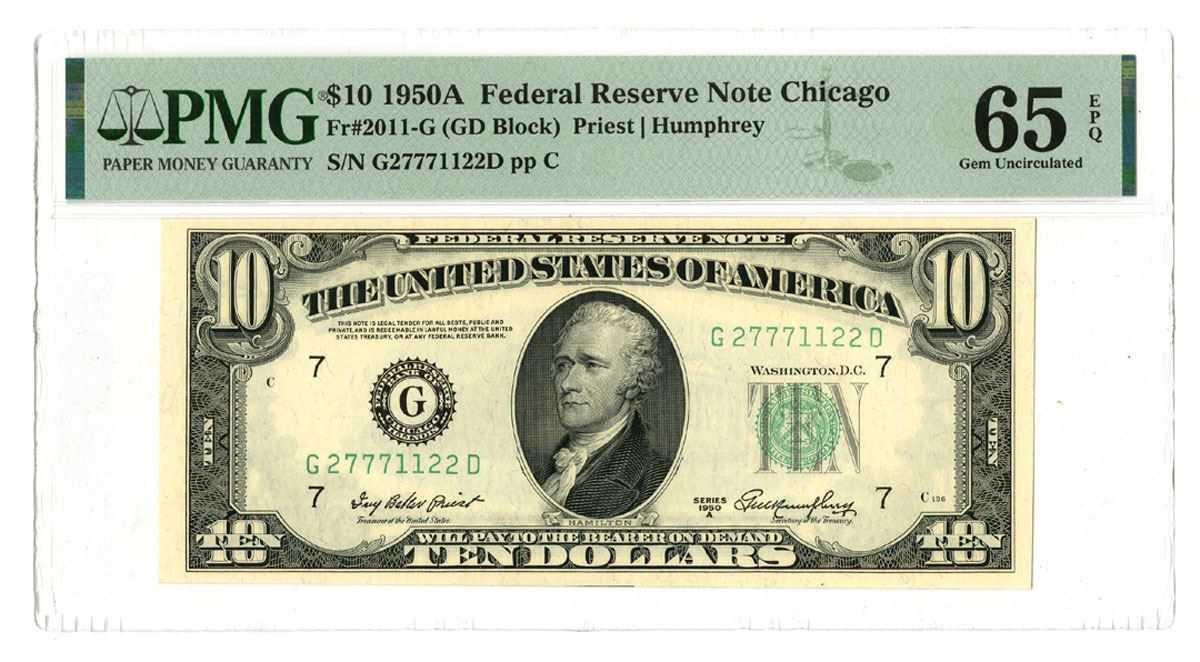 Chicago, Illinois, 1950. $10, Series of 1950A, Fr.# 2011-G, GD Block, Issued FRN Banknote, Green seal at right, Priest | Humphrey signatures, S/N G27771122D pp C, PMG graded Gem Uncirculated 65 EPQ.