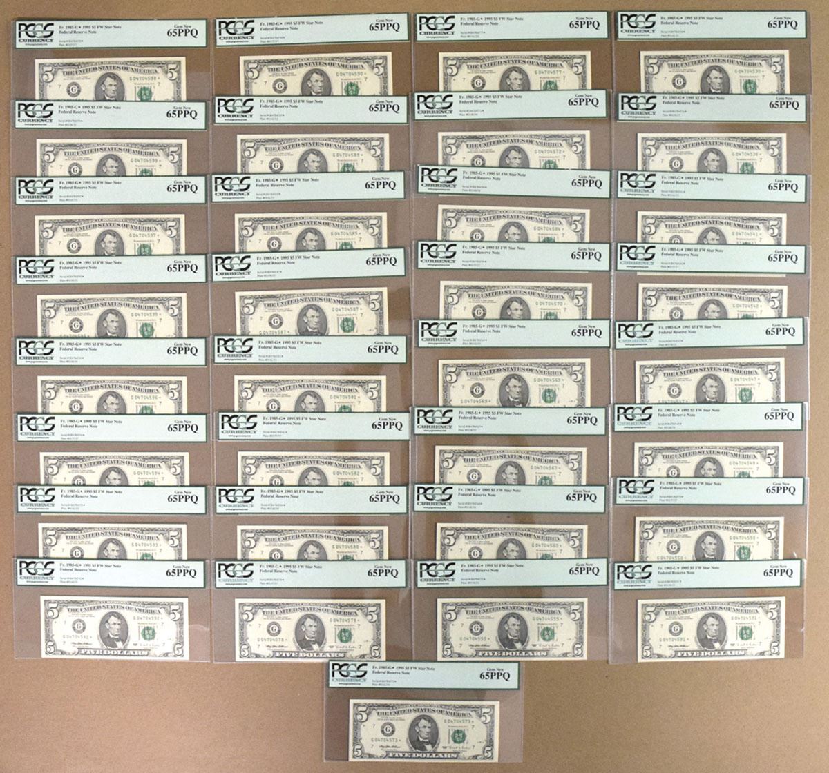 Chicago, Illinois, 1995. $5, P-496 (33) Fr.# 1985-G*, Series 1995, Issued Banknote Collection, Black print with Lincoln at center, Back is green with Lincoln Memorial at center, Withrow | Rubin signatures, Green seal at right, S/Ns range from G04704530* to G04704599* with 11 Sequential Notes (G04704589* to G04704599*), Notes are all PCGS graded Gem New 65PPQ. (33). Sold "AS IS" no returns accepted.