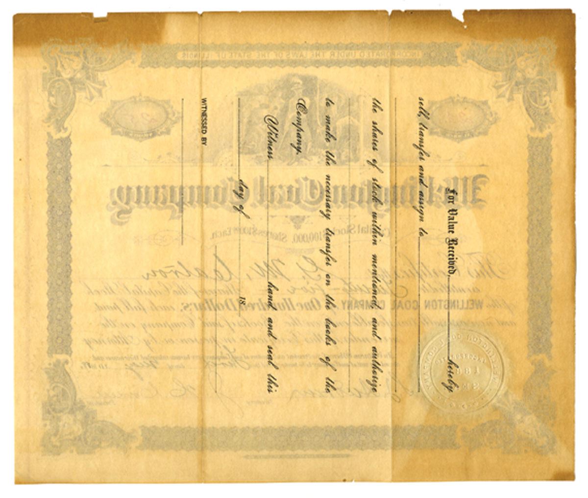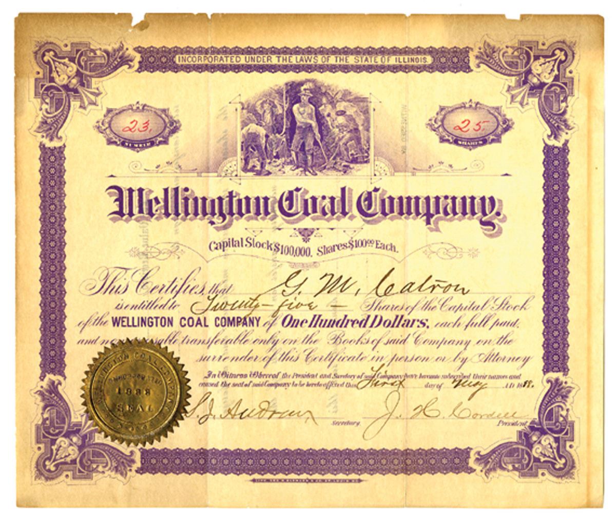 Illinois, 1888. 25 Shares I/U Capital Stock Certificate, Purple print with purple border, Vignette of shirtless men in mine at top center over title, S/N 23, Fine to VF condition with damage to top margin, Lith. Geo. D. Barnard & Co.