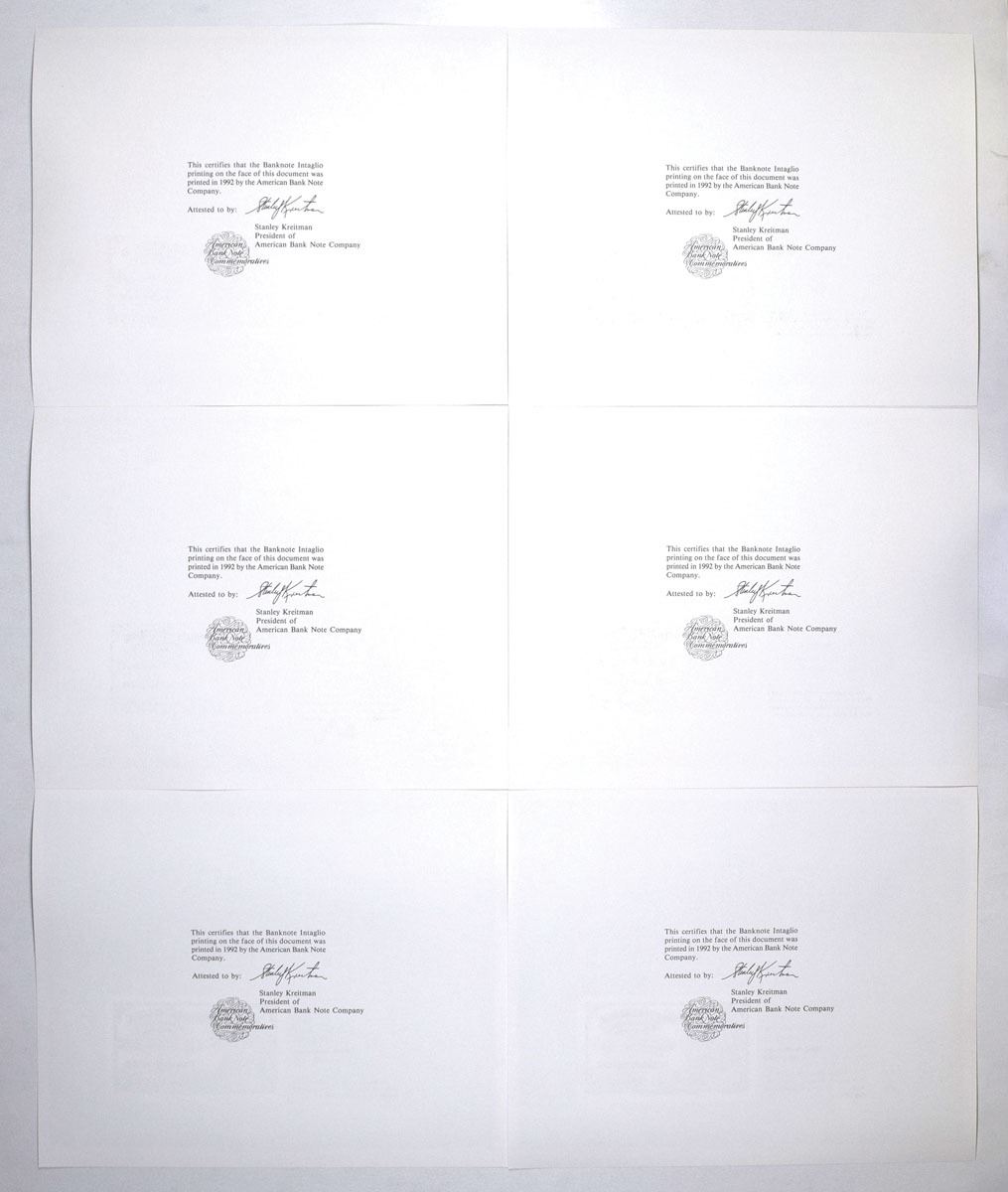 Chicago, Illinois, 1992. Lot of 6 Intaglio Souvenir Cards featuring Reprinted tickets from the World's Columbian Exposition celebrating the 500th Anniversary of the Voyages of Columbus held in Chicago, Illinois in 1893. Each card has portraits of American figures, including: Chirstopher Columbus, a Native American Chief, Abraham Lincoln, George Washington, Benjamin Franklin, and George Friedrich Handel (composer who was chosen to symbolize the expositions themes of water, architecture, and music). Cards are in AU to UNC condition. (6). Sold "AS IS" no returns accepted.