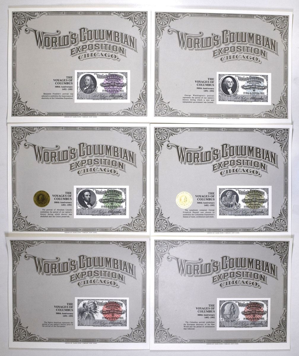 Chicago, Illinois, 1992. Lot of 6 Intaglio Souvenir Cards featuring Reprinted tickets from the World's Columbian Exposition celebrating the 500th Anniversary of the Voyages of Columbus held in Chicago, Illinois in 1893. Each card has portraits of American figures, including: Chirstopher Columbus, a Native American Chief, Abraham Lincoln, George Washington, Benjamin Franklin, and George Friedrich Handel (composer who was chosen to symbolize the expositions themes of water, architecture, and music). Cards are in AU to UNC condition. (6). Sold "AS IS" no returns accepted.