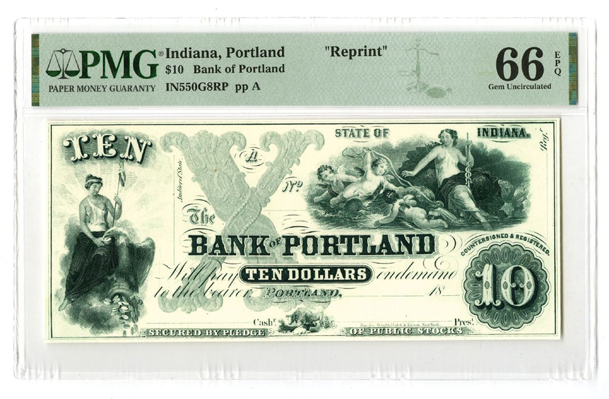 Portland, Indiana, $10, IN550G8RP pp A, Proprietary-Reprint proof obsolete banknote, Dark green printing with multiple vignettes and numerals, Uniface note, PMG graded Gem Uncirculated 66 EPQ.. Rawdon, Wright, Hatch & Edison.