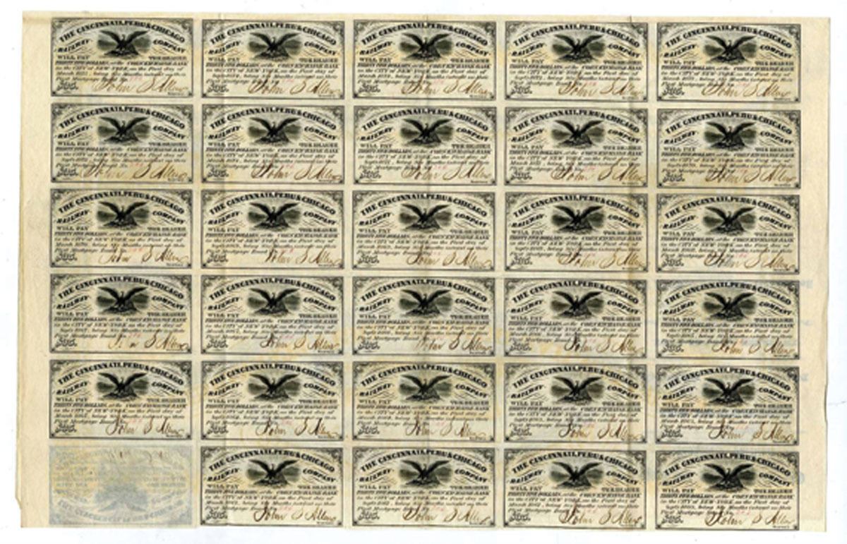 Indiana, 1855. $1000 Issued 7% Coupon Bond, Black print on large black border, Multiple vignettes on certificate largest is a locomotive below company title, S/N 205, VF-XF condition, Danforth, Wright & Co.