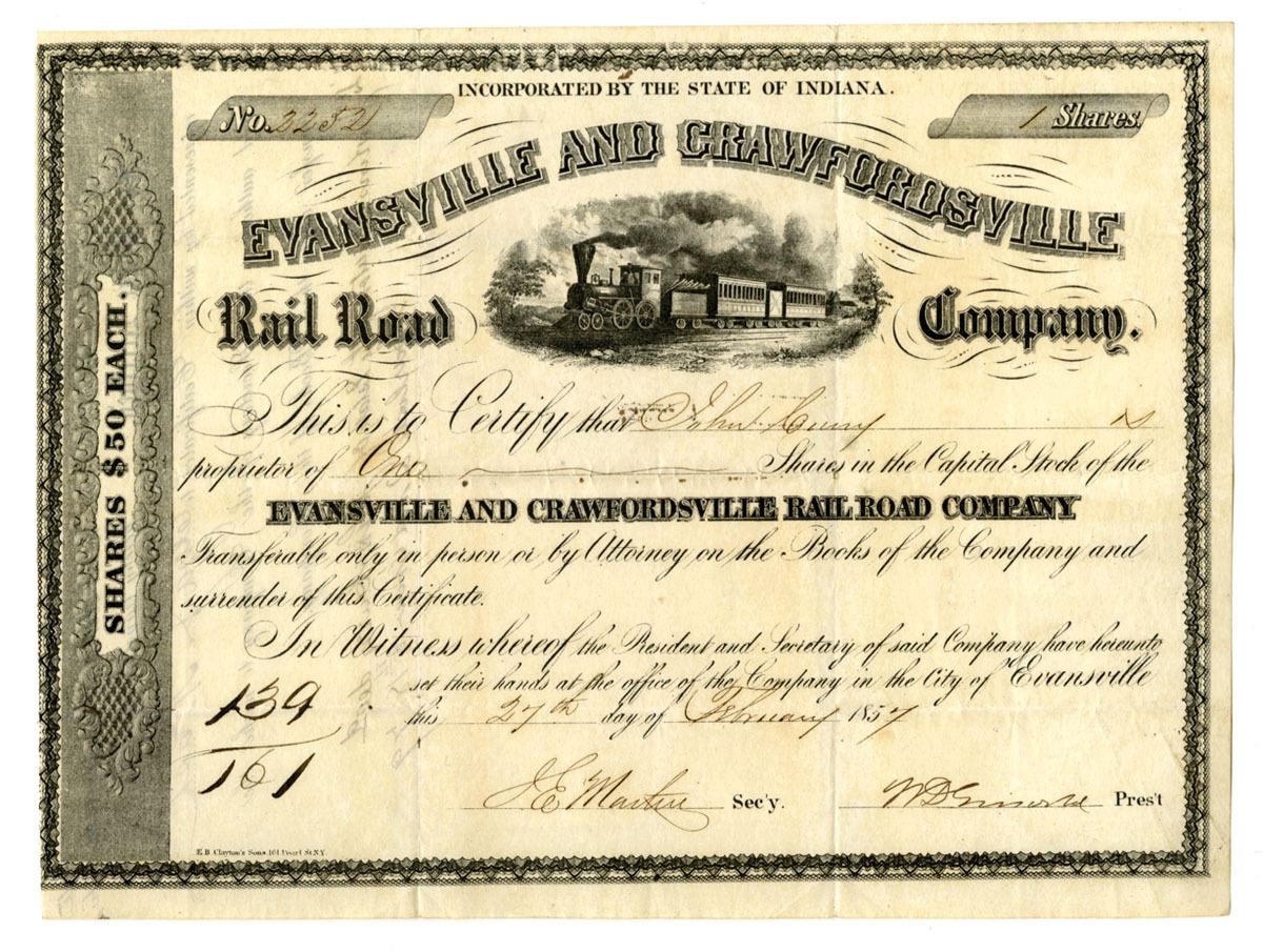 Evansville..., Indiana, 1857. 1 Share Capital Stock I/U Certificate, Black print with train moving on tracks at center under company title, Unlisted in CoxRail on white paper, only listed printed on light blue paper, S/N 2252, VF condition.