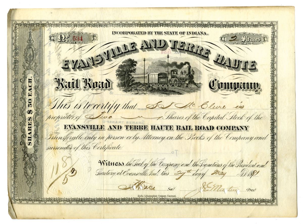Evansville, Indiana, 1881. 2 Shares Capital Stock I/C Certificate, Black print with black border, Train passing from left to right at top center, S/N 534, POCs through signatures at bottom, Fine to VF condition with minor stains.
