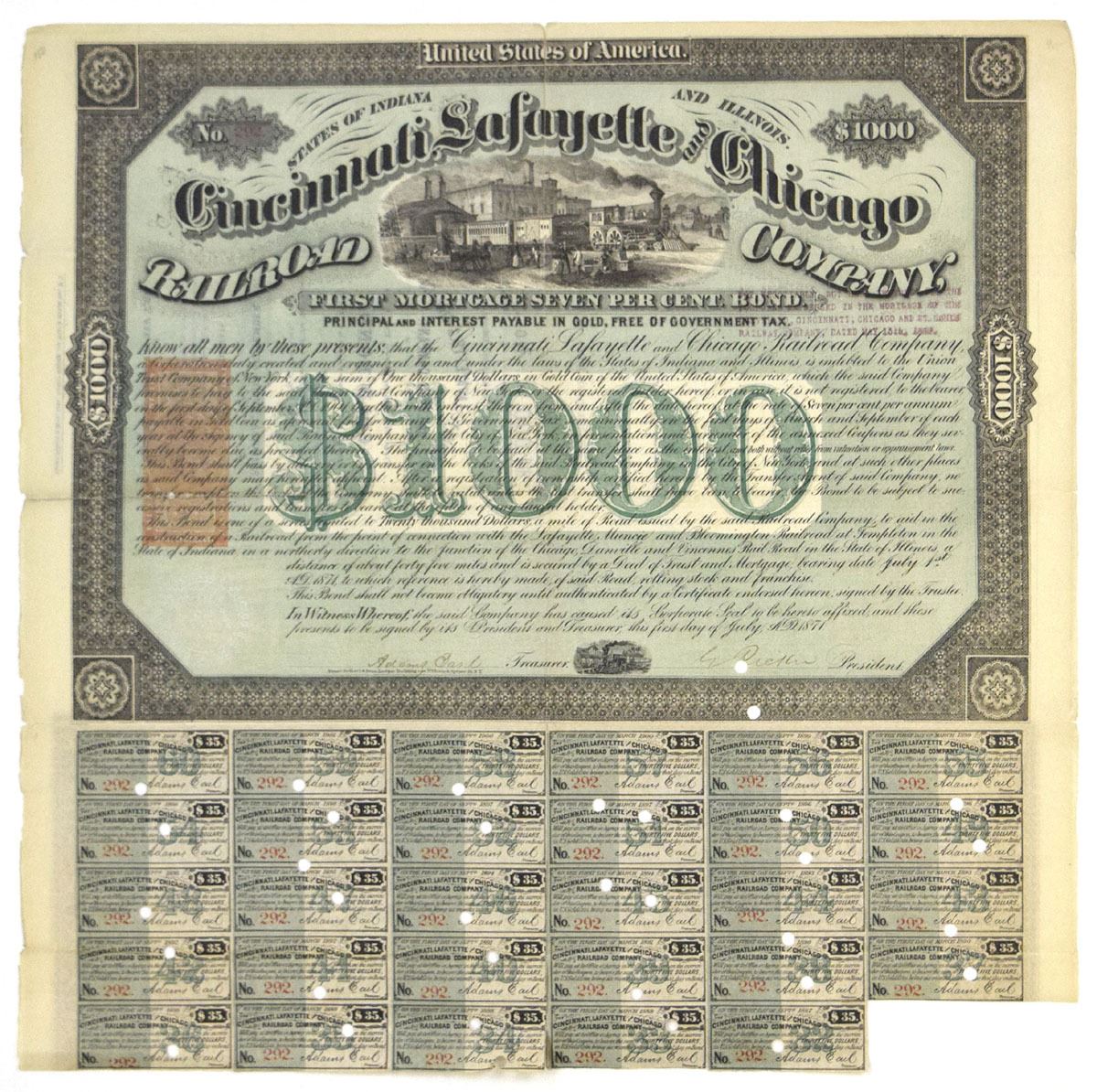 Indiana & Illinois, 1871. $1000 I/C 7% First Mortgage Coupon Bond, Black Print with black ornate border and green underprint on large sized certificate and imprinted revenue stamp at left, Vignette of train under title, S/N 292, Good to Fine condition archival repair.