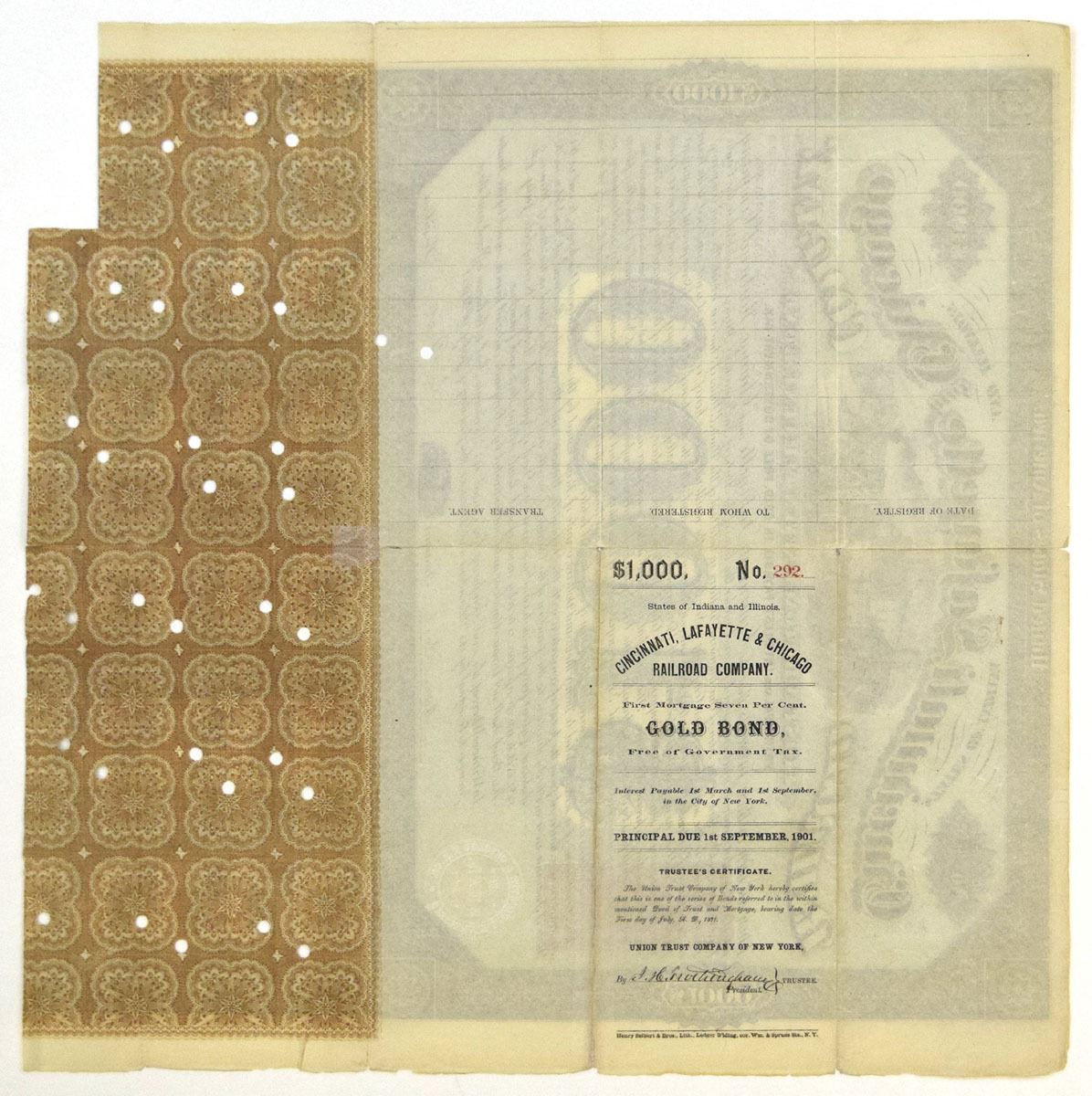 Indiana & Illinois, 1871. $1000 I/C 7% First Mortgage Coupon Bond, Black Print with black ornate border and green underprint on large sized certificate and imprinted revenue stamp at left, Vignette of train under title, S/N 292, Good to Fine condition archival repair.