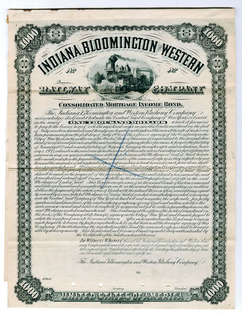 Indiana. 1881 Specimen $1000 Consolidated Mortgage Income Bond, black and white, train, with coupons attached, Almost Uncirculated, POC's and crayon cancelled, folded in thirds as made. Franklin BNC. Listed railroad in Cox, unlisted design and date. This was the only example found in the ABN archives.