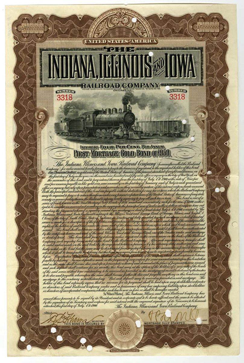 Chicago, Illinois. . Indiana, Illinois & Iowa railroad Co., 1900. $1000 I/C 4% Bond. VF-XF.WBNC