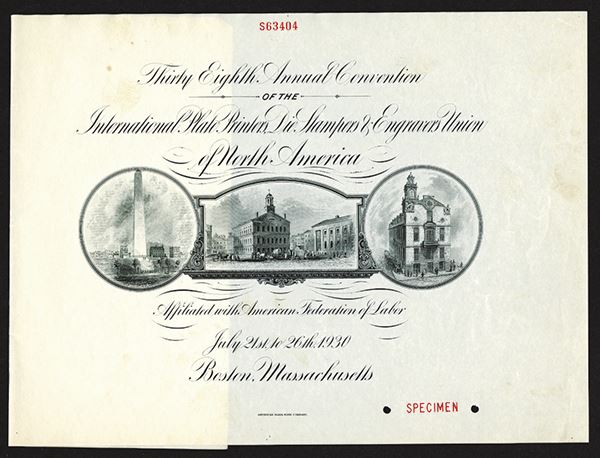 Boston, MA. 1930, Specimen cover for the Thirty-Eight Annual Convention of the International Plate Printers, Die Stampers & Engravers Union of N.A., Specimen overprint, POC, Boston landmark buildings on top. ABNC. Rare in any form. VF to XF.