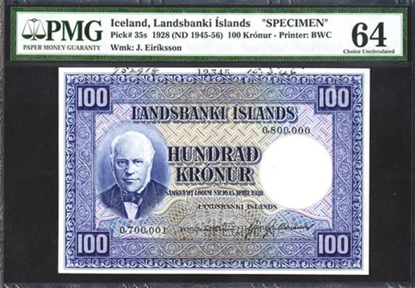 Iceland. Specimen 100 Kronur, 1928, P-35s, Blue on m/c, Pin-punch Specimen, Archival notations on top with date "15-3-(19)46", S/N 12345-0,700,001-0,00,000, PMG graded Choice Uncirculated 64 (certificate #8037641-006). BWC.