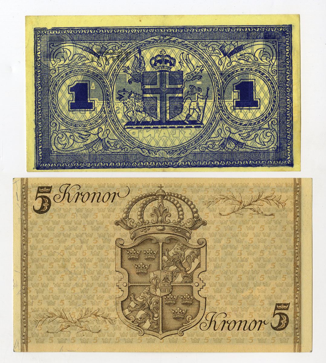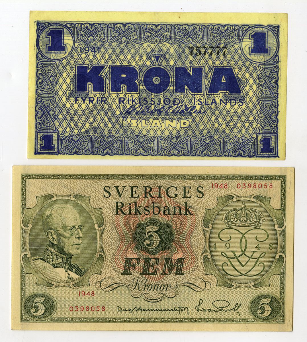 Iceland & Sweden, 1941-48. Lot of 2 Issued Banknotes, Includes: Rikissjod Islands 1 Krona, P-22a, 1941; Sveriges Riksbank 5 Kronor, P-41a, Commemorative Note. Both notes are in AU to Unc condition. (2).