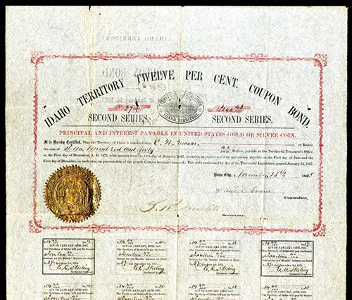 Idaho Territory, 1868, $240.43, 2nd Series 12% Coupon Bond, #37, 10 Coupons attached, Black and red print with ornate border and large gold seal bottom left, VF condition with minor holes and creasing.