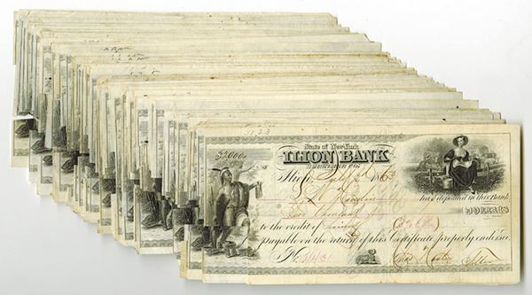 Ilion, New York, Lot of over 95 issued Certificate of Deposits, all are in Fine to VF condition but the revenue stamps have been cut off of the lower and middle left. All are engraved by RWH&E. Sold "As Is". No returns accepted.