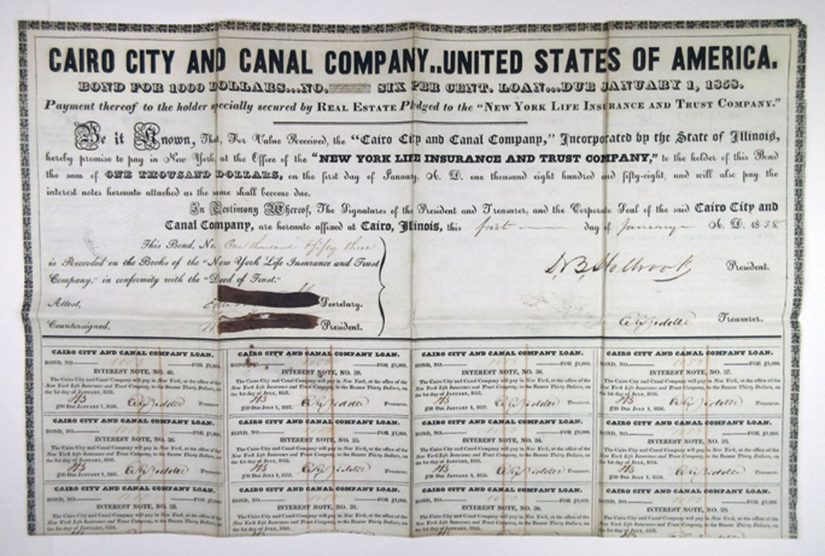 Cairo, Illinois, 1838, $1000 6% Coupon Bond, Ink Cancelled with ink burn in cancellation areas, VF condition. Rare and very early Canal Bond. The city is located at the confluence of the Ohio and Mississippi rivers. Fort Defiance, a Civil War camp, was built at the confluence in 1862 by Union General Ulysses S. Grant to control strategic access to the river. Cairo has the lowest elevation of any location in Illinois and is the only Illinois city to be surrounded by levees. It is in the area of Southern Illinois known as Little Egypt. The first municipal charter for Cairo and for the Bank of Cairo were issued in 1818, but without any settlement and without any depositors. A second and successful effort to establish a town was made by the Cairo City and Canal Company in 1836–37, with a large levee built to encircle the site. Historic bond issued in 1838 when the town was formed.