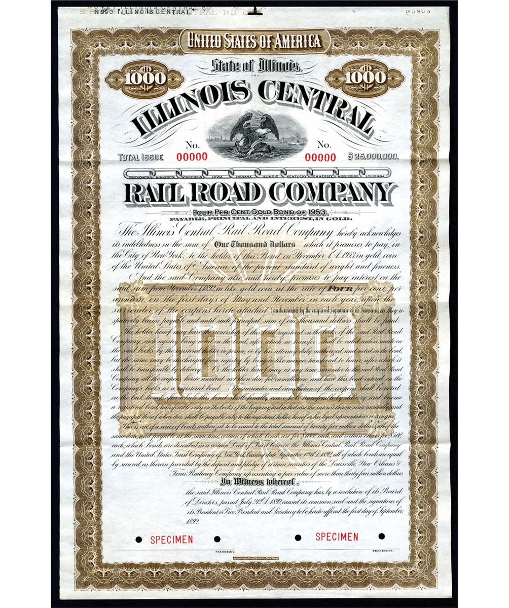 Illinois, $1000 4% Gold Bond of 1953 Specimen, brown border and underprint with patriotic eagle on top middle, no coupons attached, ABNC.