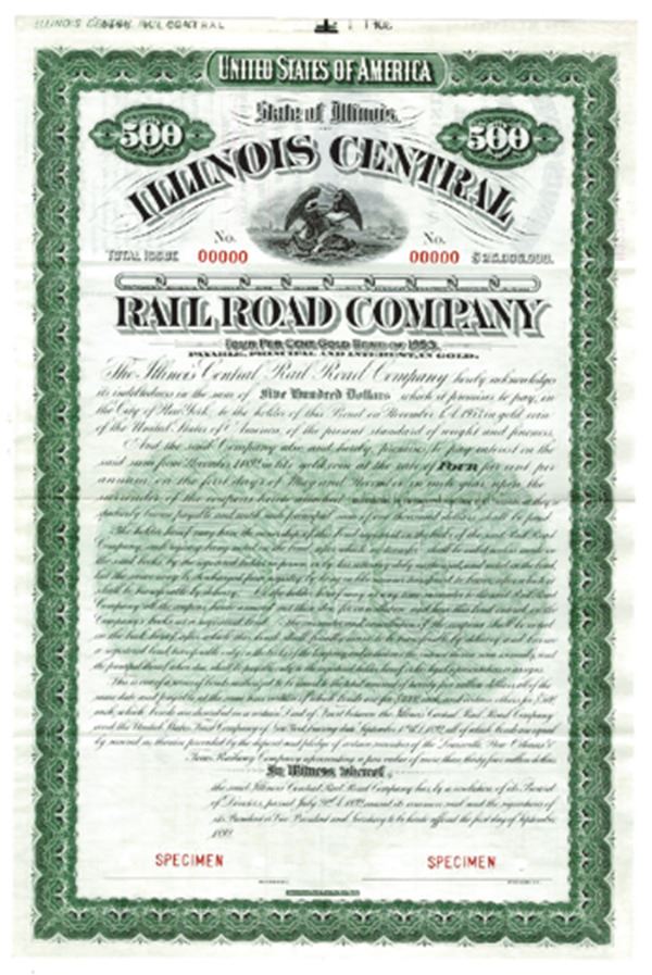 Illinois. $500 4% Gold Bond, Black print on green border and under tint, State seal of Illinois at top, Specimen overprints and POC's, VF-XF condition , ABNC.