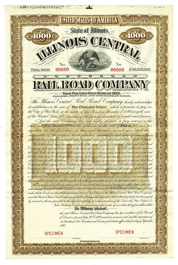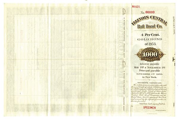 Illinois. $1000 Specimen 4% Gold Bond of 1953. Black print with a brown border and under print. Vignette of a patriotic bald eagle at the top. Specimen overprints, POC's, VF-XF condition. ABNC.
