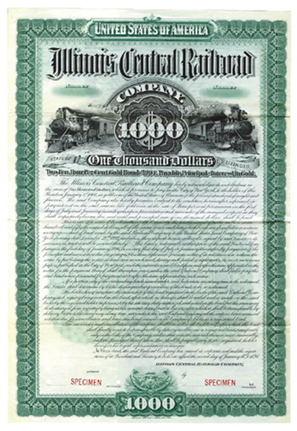 Illinois. $1000 Specimen 4% Gold Coupon Bond, Black print on green border and under tint, Locomotives coming out from behind company title at top, Specimen overprints and POC's, Fine-VF condition with splitting along fold lines condition, ABNC.
