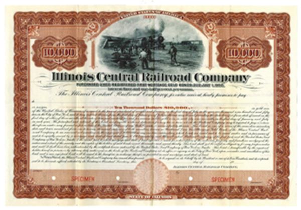 Illinois. $10000 Specimen 3 1/2% Registered 1st Mortgage Gold Bond, Black print on red/brown border and under tint in horizontal format, Men repairing tracks beside locomotive, Specimen overprints and POC's, VF-XF condition, ABNC.