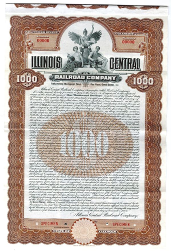 Illinois. $1000 Specimen 4$ Refunding Gold Coupon Bond, Black print on brown border and under tint, Allegorical figures at top , Specimen overprints and POC's, VF-XF condition, ABNC.