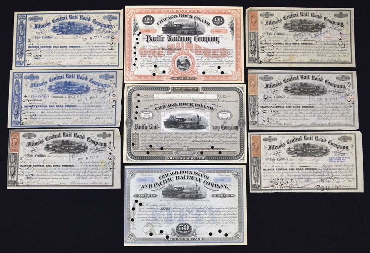 Various States, 1865-1902. Lot of 9 I/C Stock Certificates from Illinois Central Rail Road Co. and Chicago, Rock Island and Pacific Railroad Co., Certificates have POC's and range from VF to XF condition. (9). Sold "AS IS" no returns accepted.