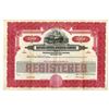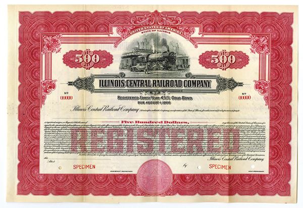 Illinois. $500 Specimen 4 3/4% Registered Gold Bond, Black print on large red border and under tint in a horizontal format, Image of an automobile parked next to a locomotive at top, Specimen overprints and POC's, VF-XF condition, ABNC. Listed Railroad on Cox, Unlisted Bond Color and Denomination.