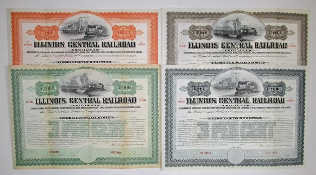 Illinois, ND (ca.1900s). Lot of 4 Specimen Bonds, Includes: $1000 Registered Bond in Brown; $1000 Registered Bond in Gray; $10,000 Registered Bond in Green; $10,000 Registered Bond in Orange. All have Specimen overprints and POCs and are in Fine-VF condition, ABNC. All unlisted in Cox. (4). Sold "AS IS" no returns accepted.