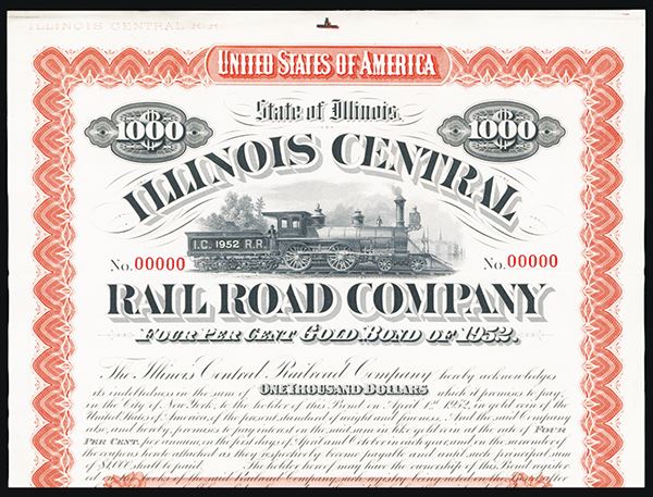 Illinois, 1888, $1000, 4% Gold Bond, Black on red with locomotive "1952" L-R on top, Specimen, POC, XF condition, No coupons. ABNC.