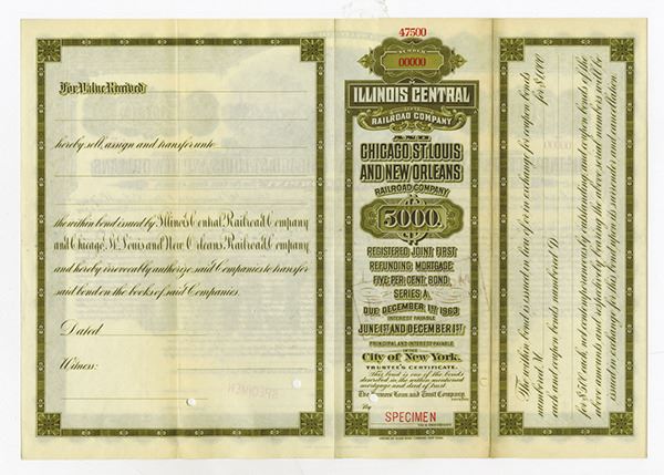 LA. MS. KY. TN.1913, $5000. Specimen Registered 4.5% joint first refunding mortgage bond, Series A. Olive Green border and underprint, with locomotive passing farming scene with track workers vignette, ABNCo. Specimen, POC's, XF, listed railroad but unlisted bond type and denomination in Cox.