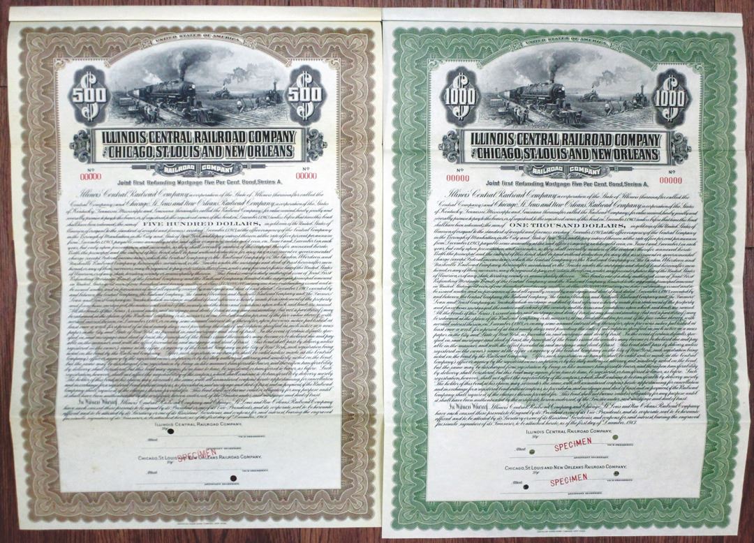 Illinois, 1913. 2 pieces: $500 Specimen 5% Joint First Refunding Mortgage Coupon Bond in brown; $1000 Specimen 5% Joint First Refunding Mortgage Coupon Bond in green. Both have red specimen overprints, 00000 serial numbers, and POCs. VF condition, ABNC. Brown bond is a rare specimen in Cox. (2)