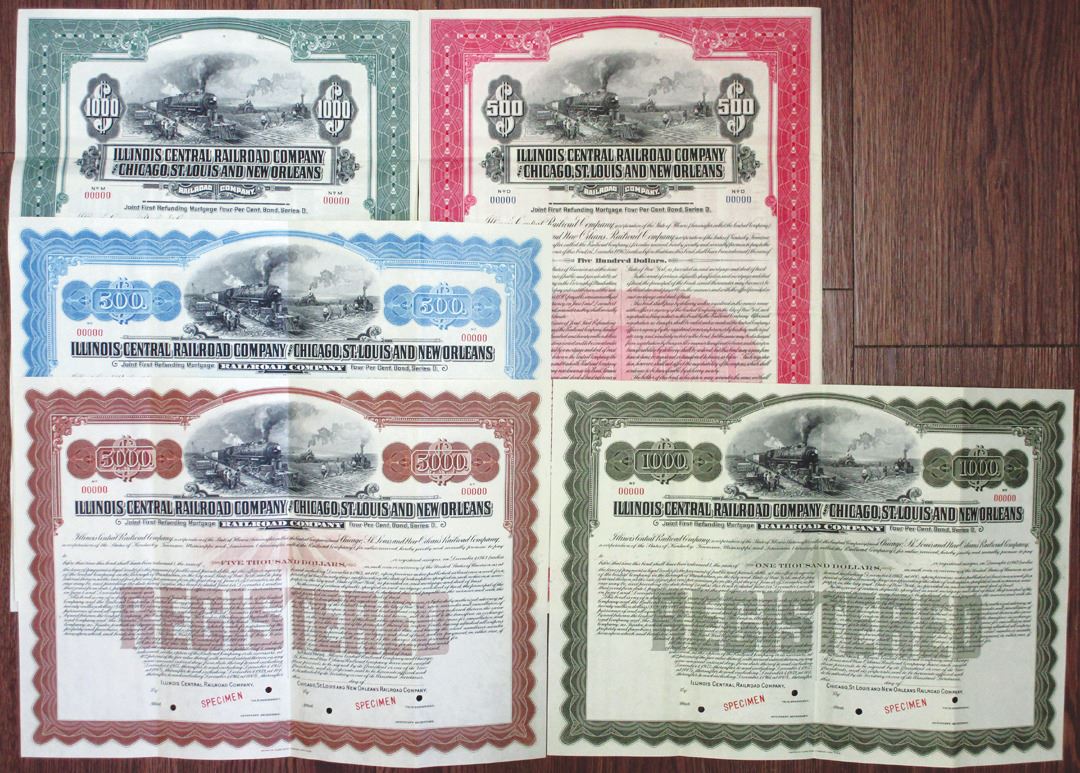 Illinois and Louisiana, 1913. Lot of 5 Specimens, Includes: $500, blue; $1000, olive; and $5000, brown, all are Specimen 4% Registered Join First Refunding Mortgage Bonds; and $500, pink; and $1000, green, both are Specimen 4% Joint First Refunding Mortgage Coupon Bonds. All have specimen overprints, 00000 serial numbers, and POCs. VF to XF condition, ABNC. All are rare specimens in Cox. (5)