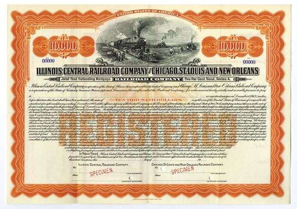 Illinois. $1000 Specimen 5% Series A Joint 1st Refunding Mortgage Registered Bond, Black print on green border and under tint. Specimen overprints and POC's, VF-XF condition. ABNC.