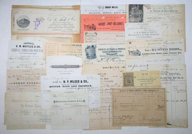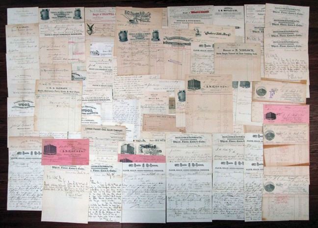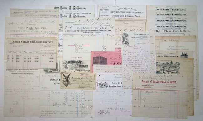 Illinois, Michigan, New York, Pennsylvania and other locations. ca.1860-1900), Lot of 100+ Invoices, Receipts, Illustrated billheads and letterheads and business correspondence. Assortment for various businesses, Includes: Pierce, Butler & Pierce Manufacturing Co., Hollowell & Wise, Henry, Johnson & Lord, Sniggs & Stickney General Commission Merchants, R. Ovens, and many more. Documents are in VG to XF condition. MAny detailed letters and correspondence worthy of a careful evaluation. (100+). Sold "AS IS" no returns accepted.
