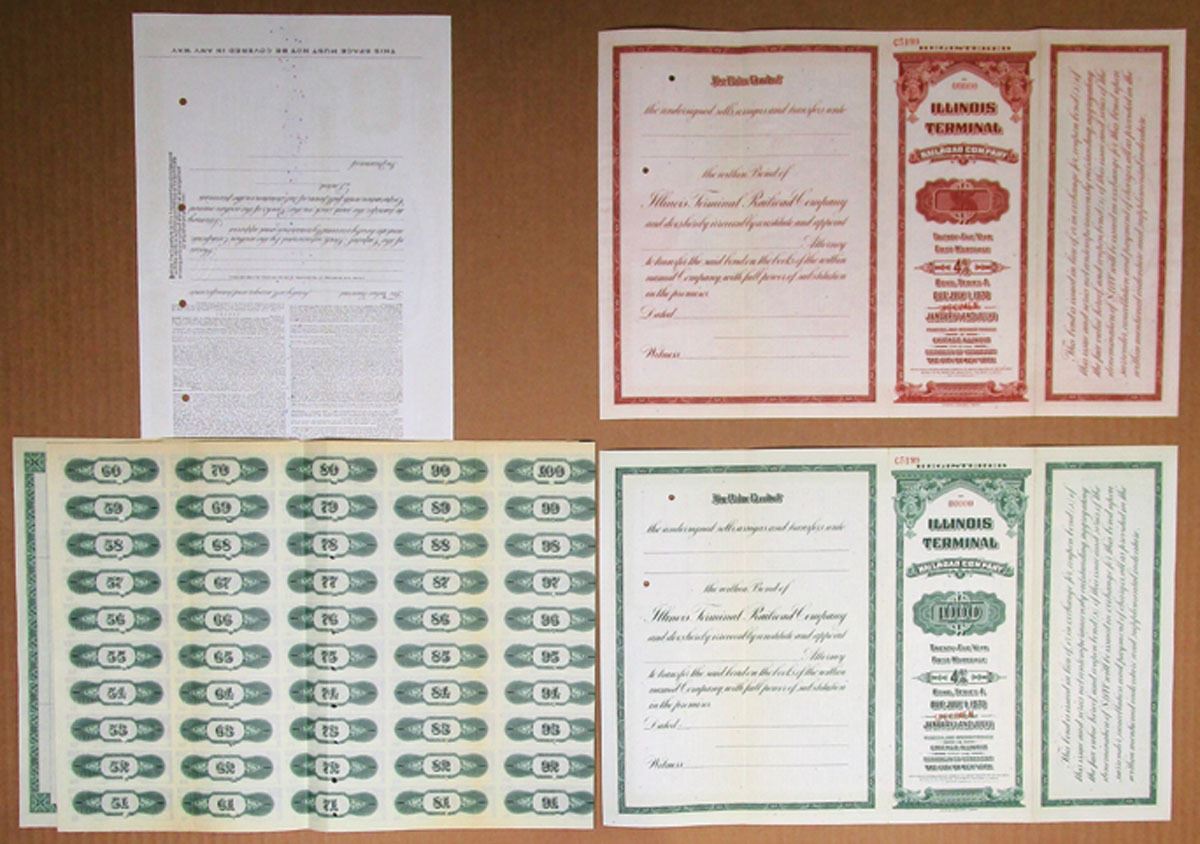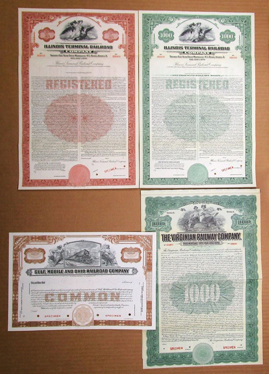 Illinois, Mississippi, Virginia, 1912 to 1957. Lot of 4 Specimen Certificates, Includes: VA. Virginian Railway Co. $1000 5% Coupon Bond, 1912; Illinois Terminal Railroad Co. $- Odd and $1000 Vertical Registered Bonds, 1957; and, Mississippi, Gulf, Mobile and Ohio Railroad Co., <100 Shares Specimen Stock Certificate. All have Specimen overprints, POCs, and in XF to CU condition. (4). Sold "AS IS" no returns accepted.