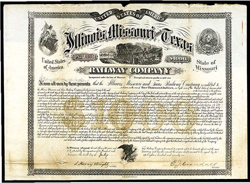 Missouri, 1871, $1000, 7% I/U Bond, #1440, Horizontal format, Coupons attached, Vignette of locomotive at station top center allegorical women on left state seal on right with bald eagle bottom center, Fine condition with toning creases and some tears from folding, A.Gast & Co. Listed railroad and bond in Cox.