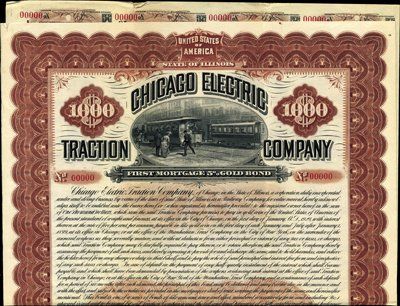 1899. $1,000. Specimen 1st Mortgage 5% Gold Bond. Brown border. Street car scene on top and eagle on bottom. Red specimen overprints, POC's and "00000" serial numbers. XF condition. Unlisted railroad in Cox. ABNC.