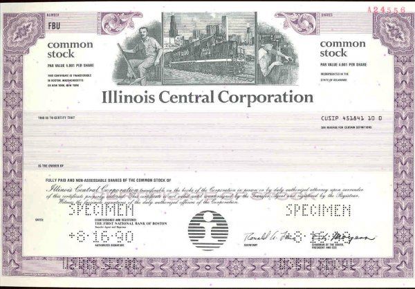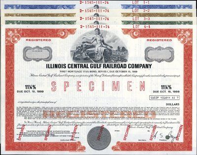 ca.1970's. 6 different specimen bonds and 1 stock. 5 are Illinois Central Gulf RR Registered bonds and 1 is a stock. All in various denominations, shares and colors. All are in choice condition. Red "Specimen" overprints, "00000" serial numbers and POC's. ABNC.