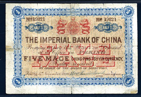 China, 5 Mace, P-A39a (S/M#C293-1b), Issued banknote, Dark blue, brown and red on orange underprint, Dragons supporting shield at top center, S/N 19821, PMG graded Fine 12 NET with notation of fold split repairs and pin holes which are difficult to view. Rare note in any condition and this example appears with bright colors and large margins. BFL, printer. Only four examples graded in the PMG census.