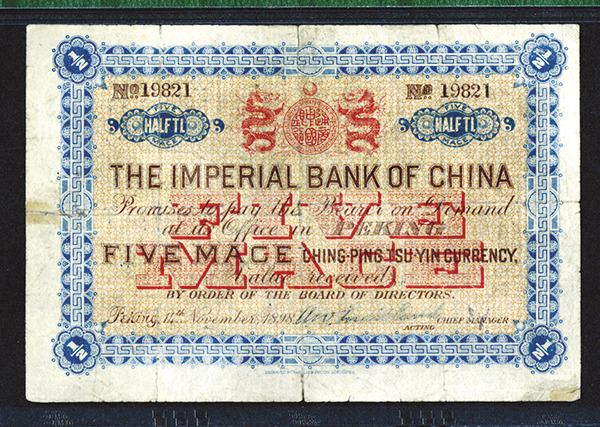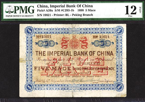 China, 5 Mace, P-A39a (S/M#C293-1b), Issued banknote, Dark blue, brown and red on orange underprint, Dragons supporting shield at top center, S/N 19821, PMG graded Fine 12 NET with notation of fold split repairs and pin holes which are difficult to view. Rare note in any condition and this example appears with bright colors and large margins. BFL, printer. Only four examples graded in the PMG census.