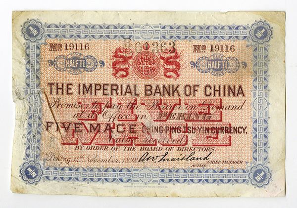 Peking, China. 5 Mace, P-A39a (S/M#C293-1b), Issued banknote, Dark blue, brown and red on orange underprint, Dragons supporting shield at top center, S/N 19116, The top margin has an additional serial number "B/P 01363, Unlisted with this number, possibly a tracking or re-issue number. Appears Fine to VF but the left margin is torn and folded, so please examine carefully. Scarce note in any condition and this example appears with bright colors and large margins. BFL, printer.