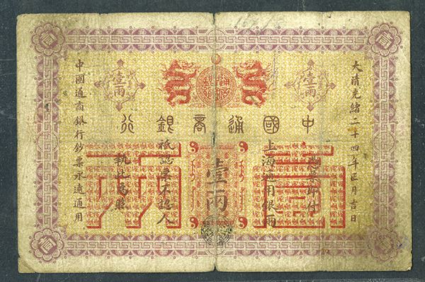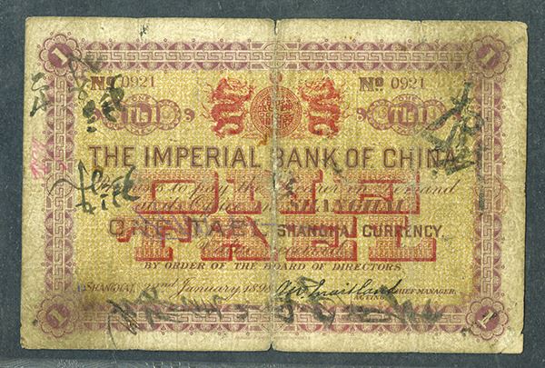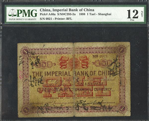 Shanghai, China, 1898. 1 Tael Shanghai Currency, P-A46a, (S/M #C293-2a), Issued banknote, Brown, Purple and red on light yellow underprint, Facing dragons supporting shield, S/N 0921, PMG graded Fine 12 NET with note of Splits and rust. Scarce note. Printer BFL.
